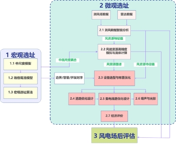 构建风电场全生命周期技术经济模型,提出设备选型与微观选址智能算口法,建立道路、海/陆变电站、集电系统非线性拓扑优化模型:引入宏-微观选址互馈,实现发电量、成本和可靠性等多目标一体化高鲁棒协同优化。