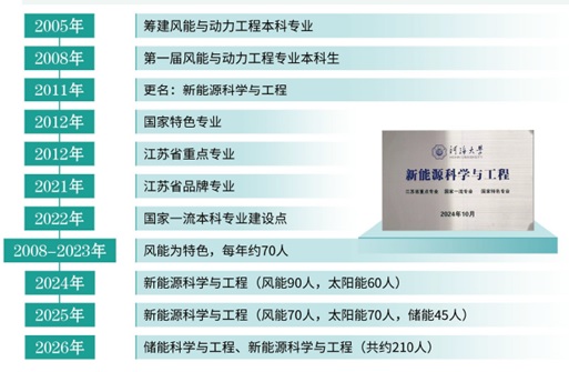 风电方向本科学科-可再生能源学科可以追溯至1958年水利部批准成立的水力动力装置专业,2005年筹建新能源科学与工程本科专业,2008年第一届风能与动力工程本科专业招生,2011年更名为新能源科学与工程专业招生,同年成功申报为国家特色专业建设点,2012年成功申报为江苏省重点专业建设点,2021年成功入选国家一流本科专业建设点。2011年设置清洁能源技术硕士点,2022年教育部批准设立新能源科学与工程交叉学科博士点。